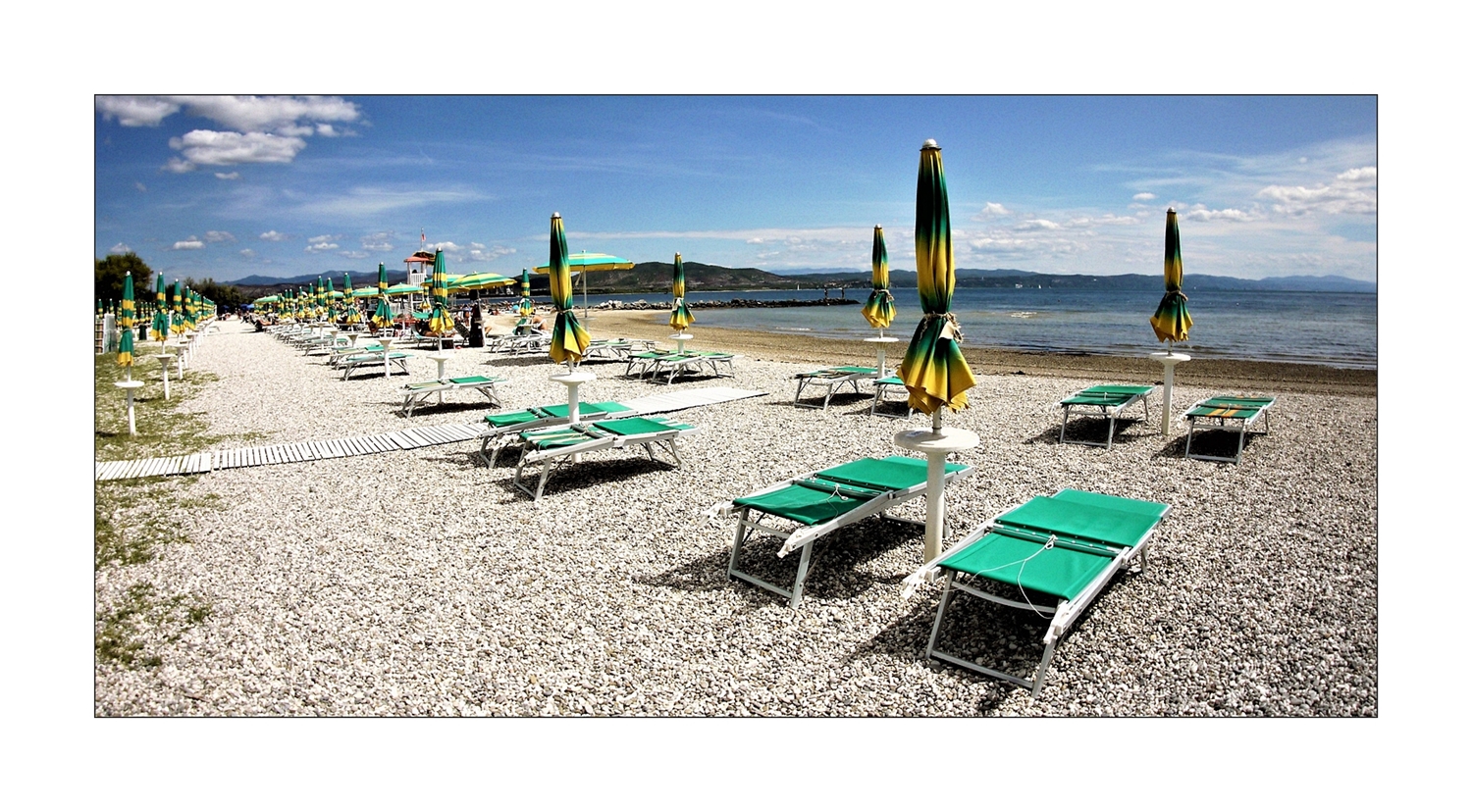 Bello il formato panoramico. L'occhio viene subito attratto dalla lunga prospettiva a sx tra ombrelloni e lettini e successivamente a dx a scrutare l'azzurro del cielo e del mare. Sii incontrano poco vacanzieri ma l'occhio rimane appagato dalla visuale. Una bella proposta _________________ Giuseppe |