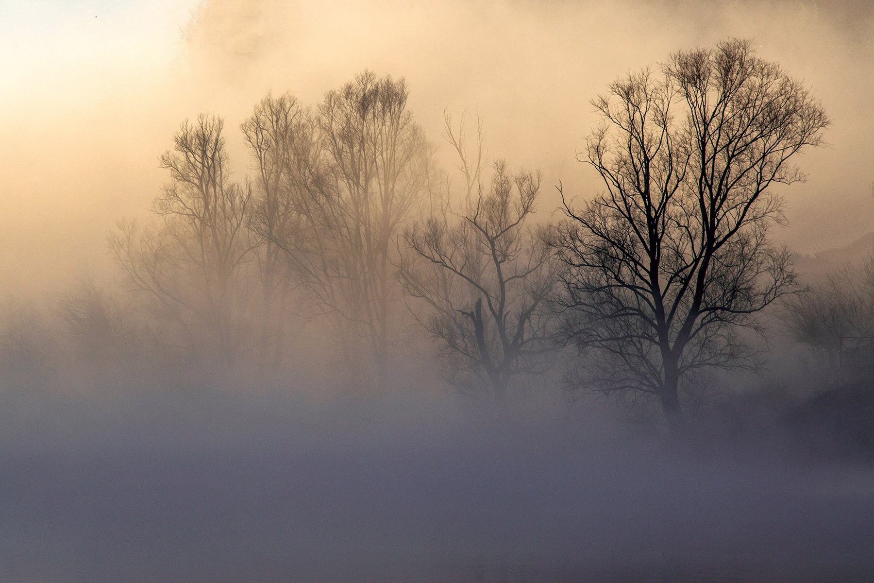 Bello in questa immagine il passaggio graduale dalle tinte calde del cielo a quelle fredde della bruma. Gli alberi sembrano affondare le radici nel nulla...