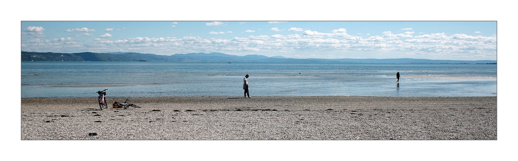 | Questa la trovo molto più interessante della precedente . Ottima la scelta del formato ampiamente panoramico che meglio evidenzia la posizione dei tre elementi sulla diagonale così come la postura dei due ragazzi nel momento di scatto, lui con testa china mentre lei si allontana tra le acque. Mi piace. Un saluto, guido |