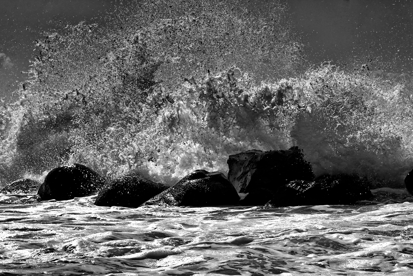 Una rappresentazione molto efficace della potenza delle onde che si infrangono sui massi avallata anche dalle onde schiumose. Forse un po eccessivo il contrasto