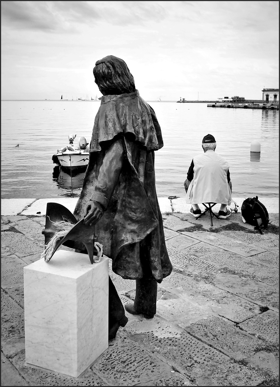 La resa del bianconero è ottima. I due personaggi, la statua e l'uomo, sono accomunati per rivolgere lo sguardo verso il mare. Ma mentre la statua guarda lontano, verso l'orizzonte, il pescatore getta lo sguardo molto vicino. La scena è coinvolgente coadiuvata da un ottimo bianconero e per questo molto apprezzabile _________________ Giuseppe |