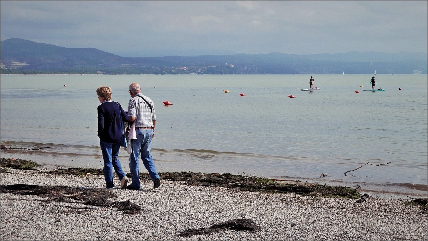 Una scena piacevole, c'e chi è già con la maglia in riva al mare, e chi ancora in costume a remare sulla tavola.. Una buona composizione quella che ci proponi. Ben vista.