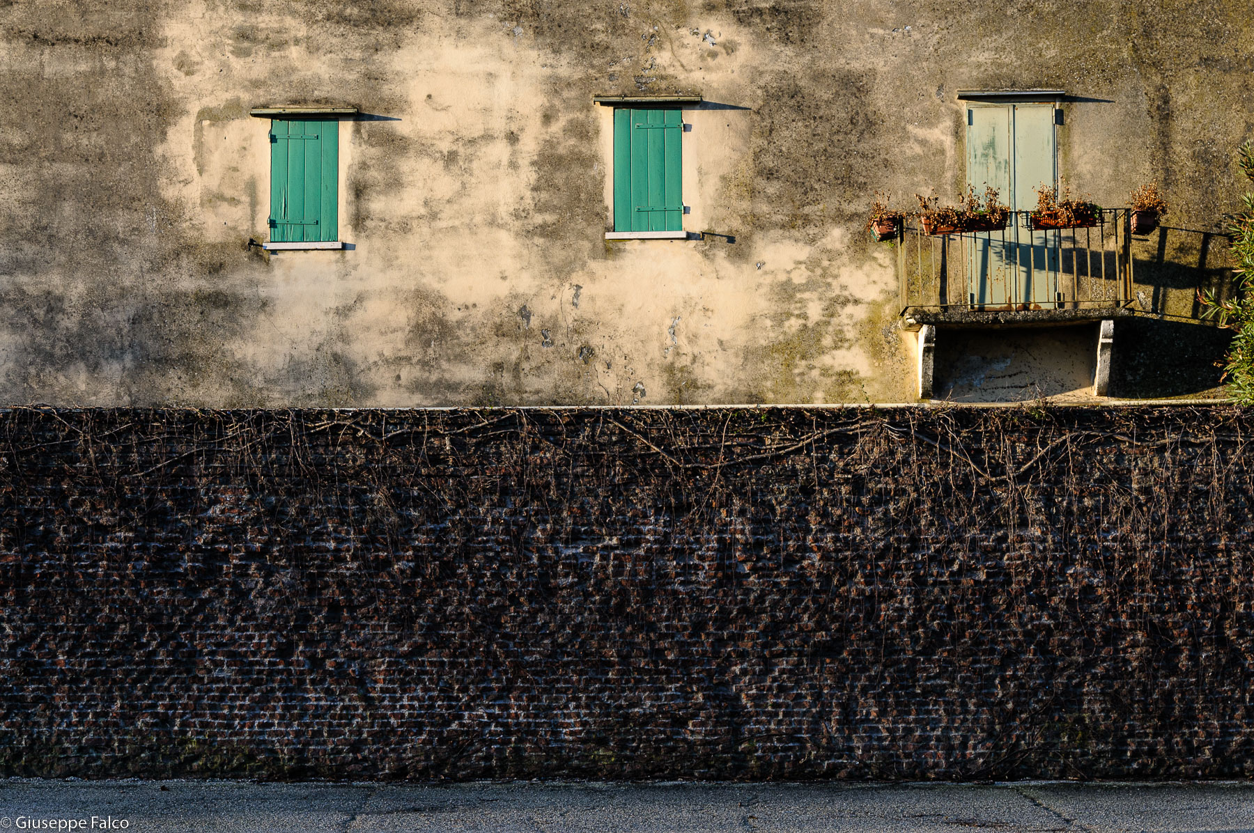 Nella sua semplicità, ne hai tratto una buona composizione di questo muretto abbinandolo alle due finestrelle dai colori che si addicono bene ha tutta l'immagine, anche il terrazzino ne fà una buona comparsa.. Mi piace. Ciao