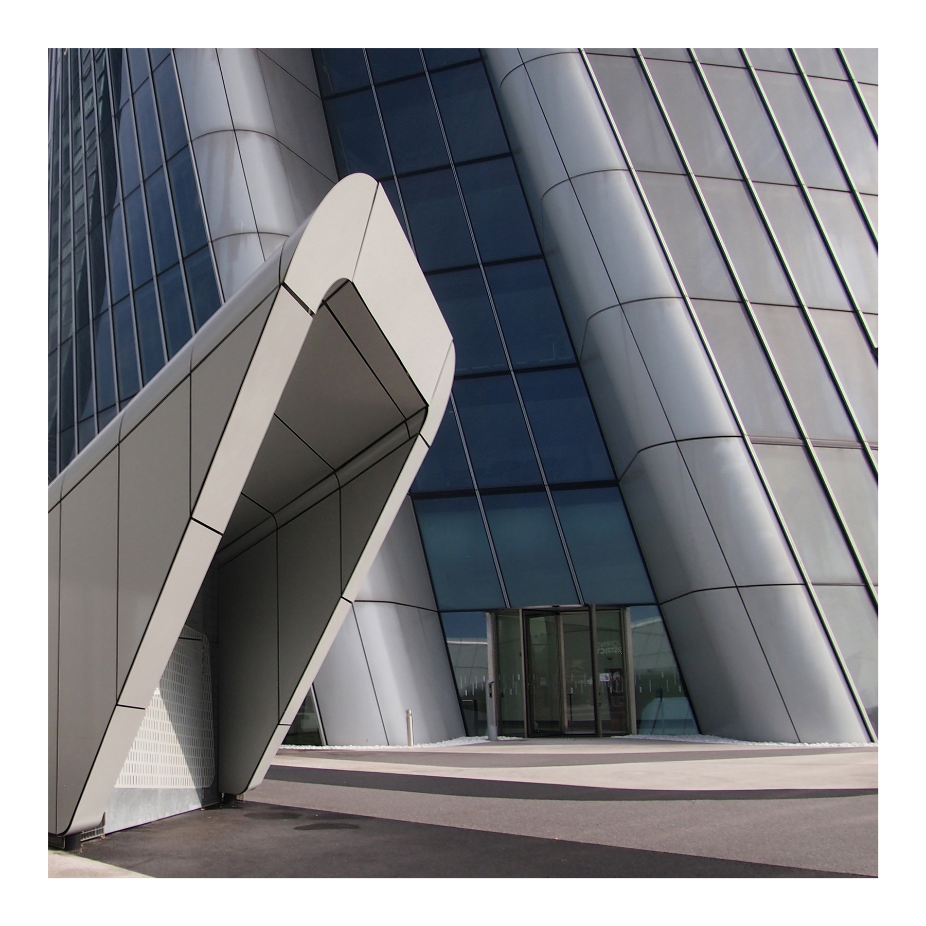 L'occhio è attratto dalla pendenza dell'elemento a destra, contraria a quella all'edificio alle sue spalle; una contrapposizione che "spiazza" ma che attrae allo stesso tempo l'osservatore, il tutto condito con cromie delicate e metalliche.