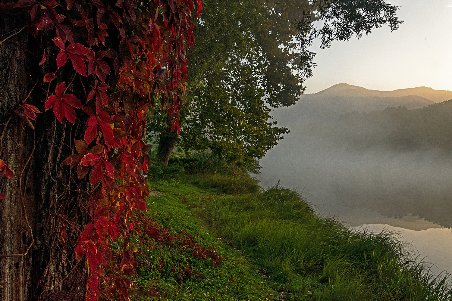 Queste foglie rosse sono uno spettacolo. Mi piace un sacco come è suddiviso il frame, la composizione, insieme ai bellissimi colori e all'atmosfera, sono sicuramente i punti di forza di questa piacevole immagine. Mi sembra solo di notare un leggero alone chiaro intorno alle chiome degli alberi .  _________________