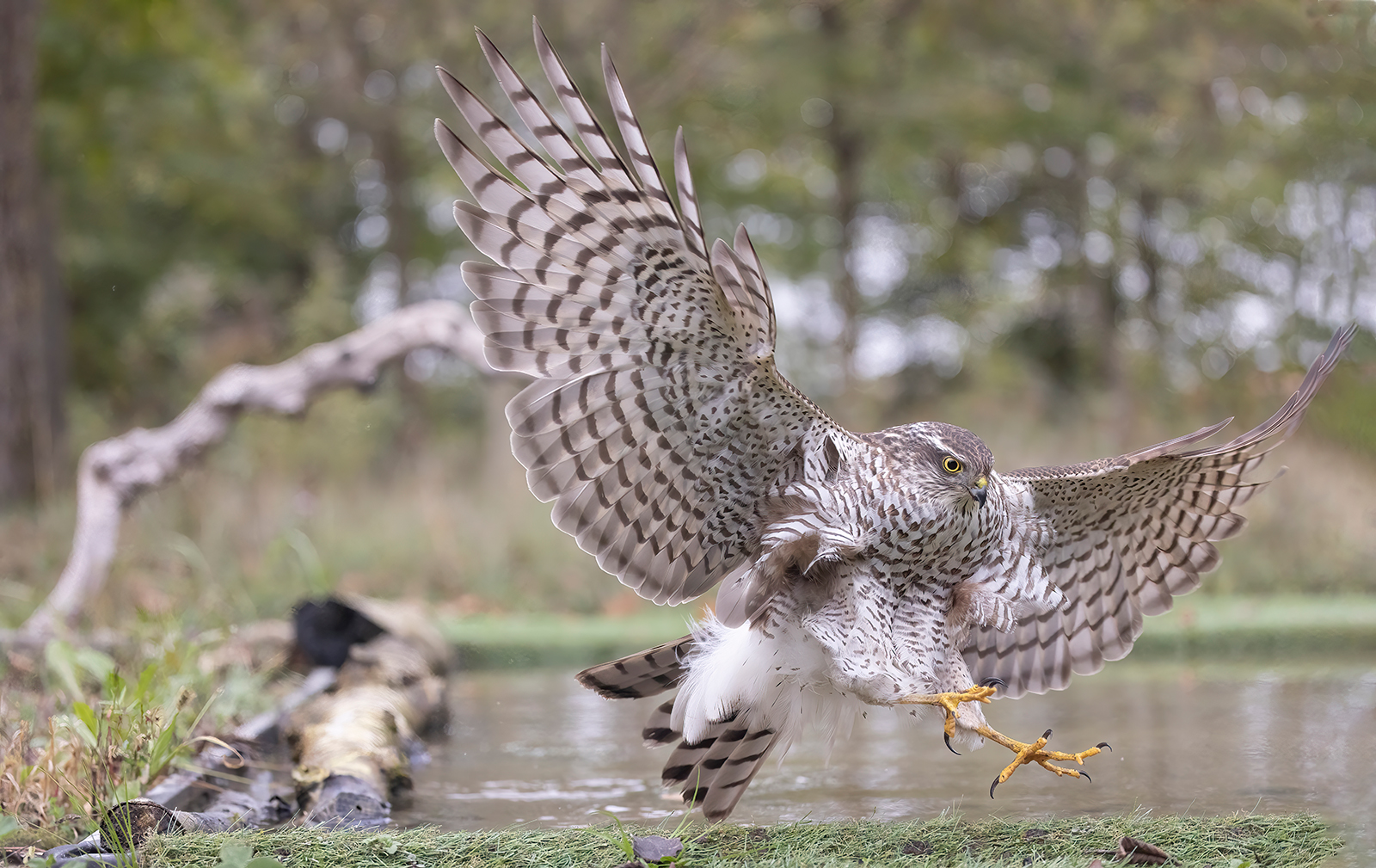 un'altra immagine del volo dello sparviere da un posatoio all'altro.