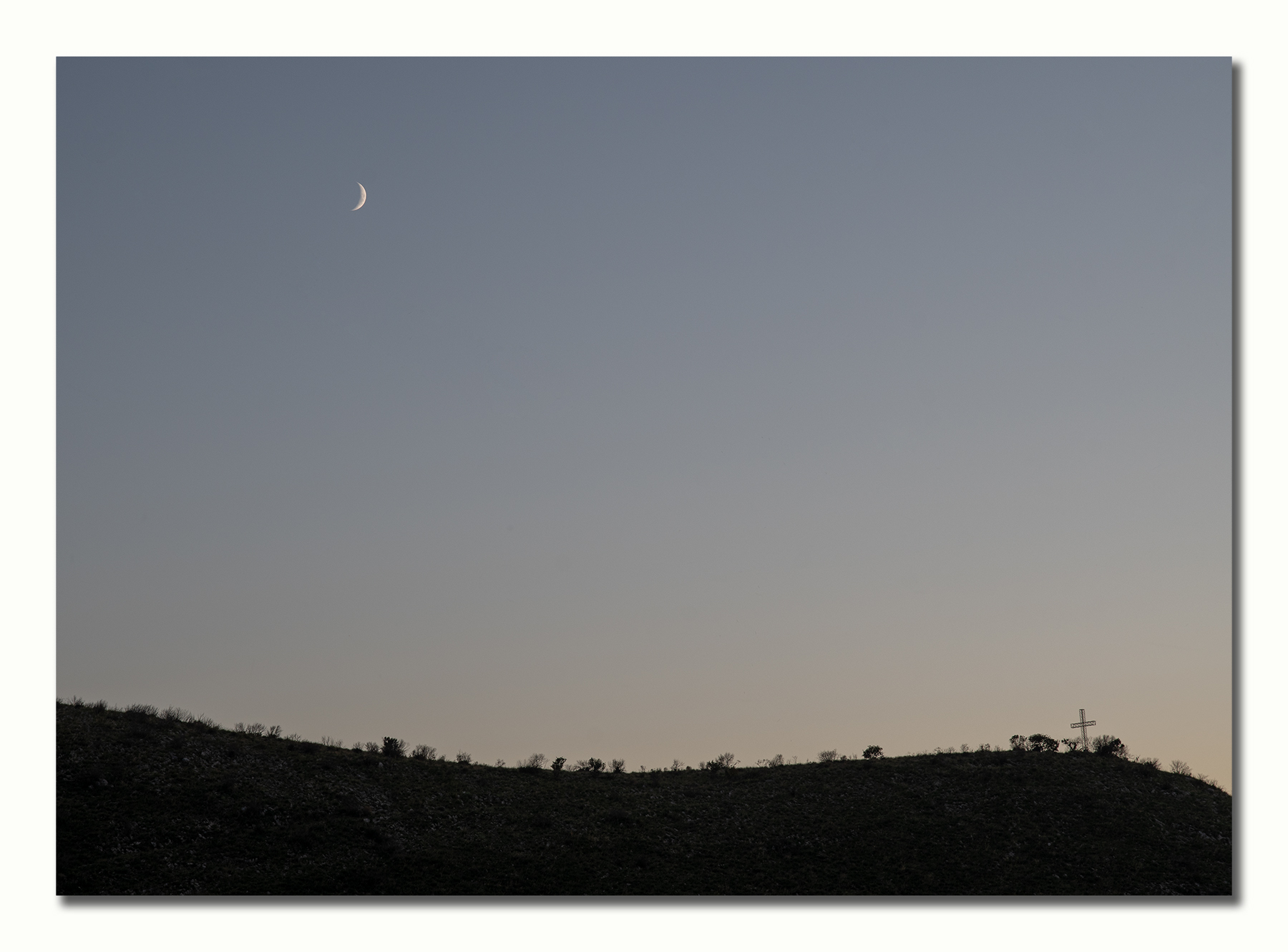 Un minimal ben eseguito con l'ampio spazio negativo occupato dalla luna che domina il paesaggio e che sembra scrutare la croce. Per me una buona proposta _________________ Giuseppe |