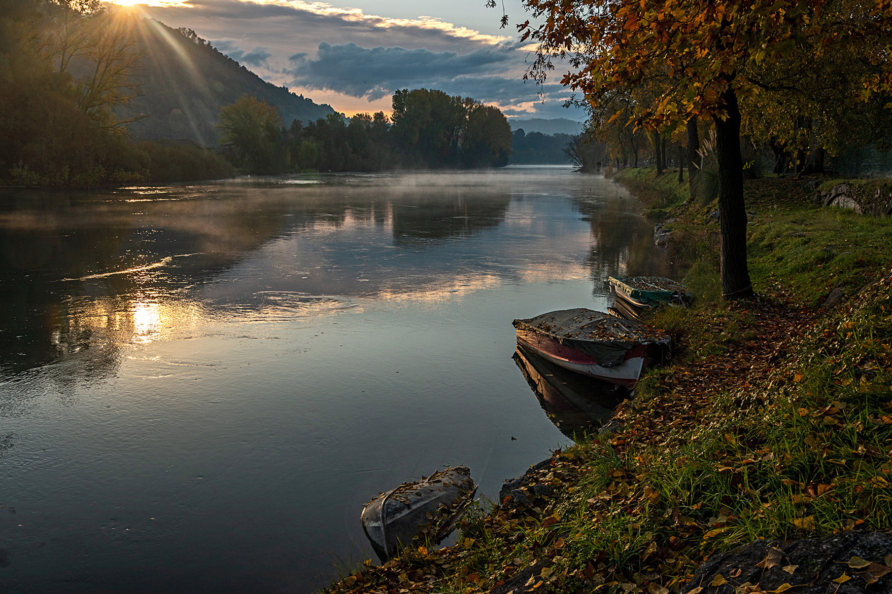 Queste barche mezze affondate e il depositarsi delle foglie autunnali sopra di esse conferiscono all'immagine una nota di malinconia così come le nubi come le nubi sullo sfondo sembrano presentire l'imminente stagione invernale. La luce è calda ma non troppo e la sfera del sole coi suoi raggi sembra non penetrare troppo e sembra delineare con ciò la sua parabola discendente di incidenza sulla superficie del nostro pianeta che si avvia al solstizio più freddo.