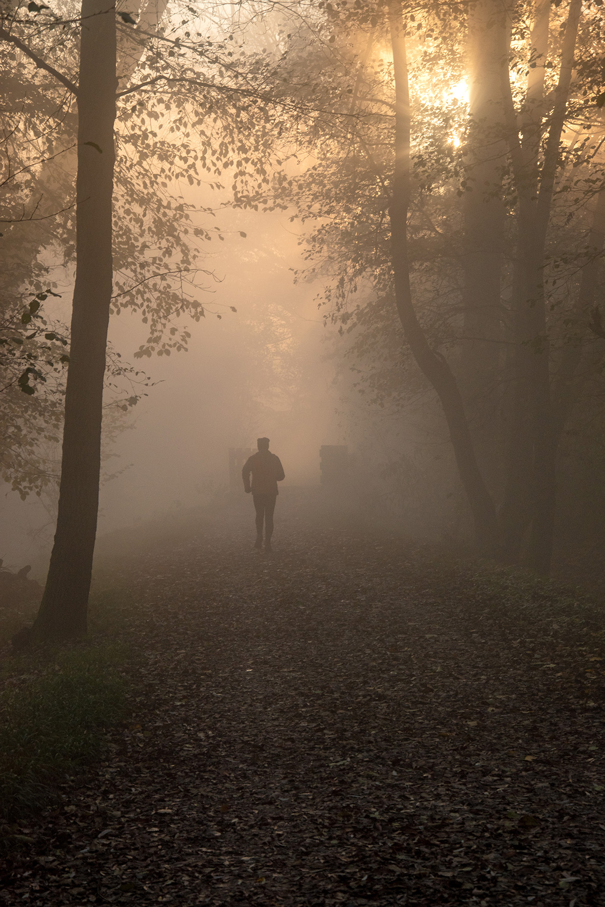 Un momento di footing mattutino in un giorno di nebbia. Mi par di sentire il calore del fiato del podista e la nuvola che si propaga introno a viso e collo.