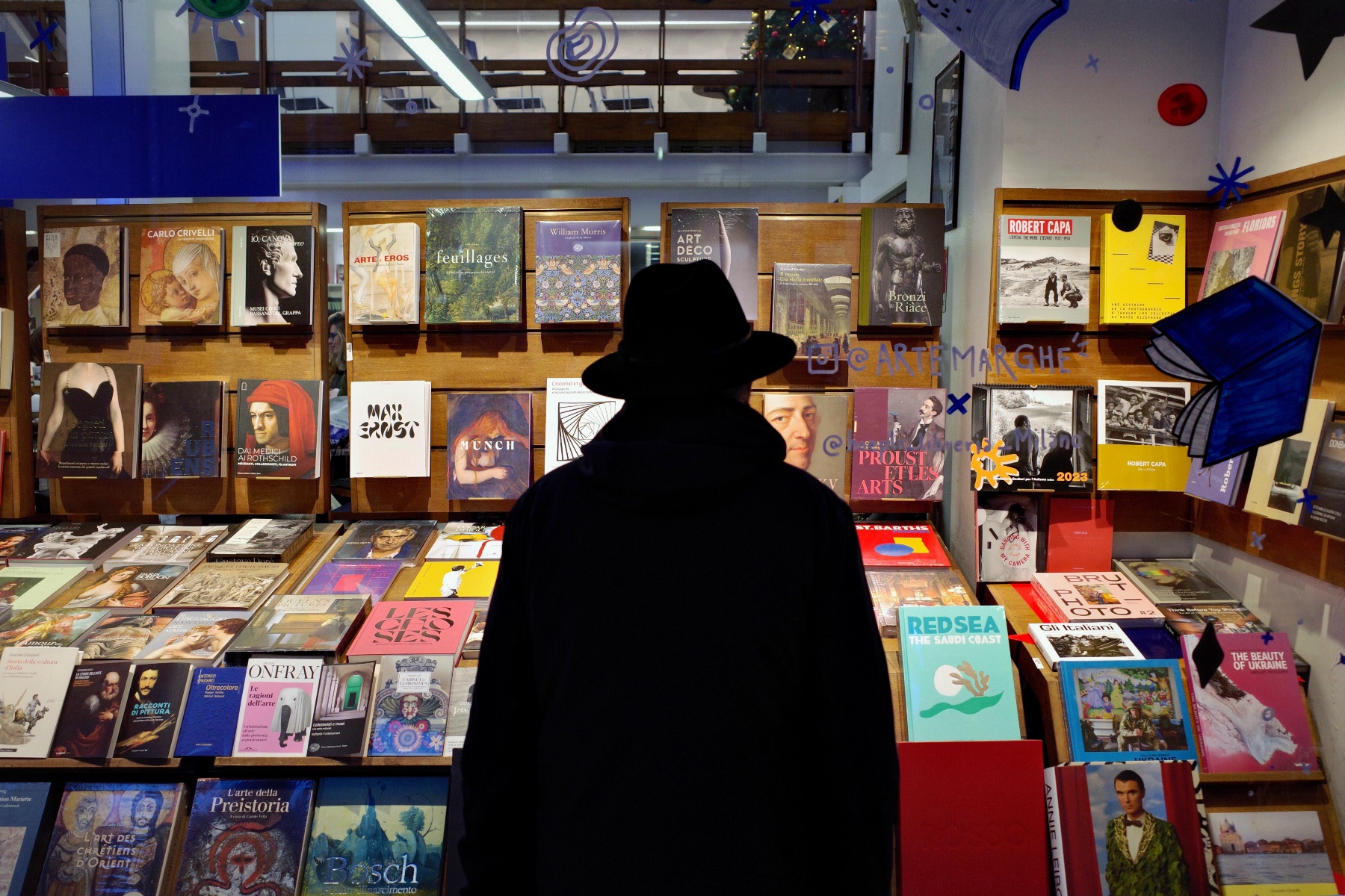 misterioso l'uomo in nero, in contrasto con i colori dei libri.