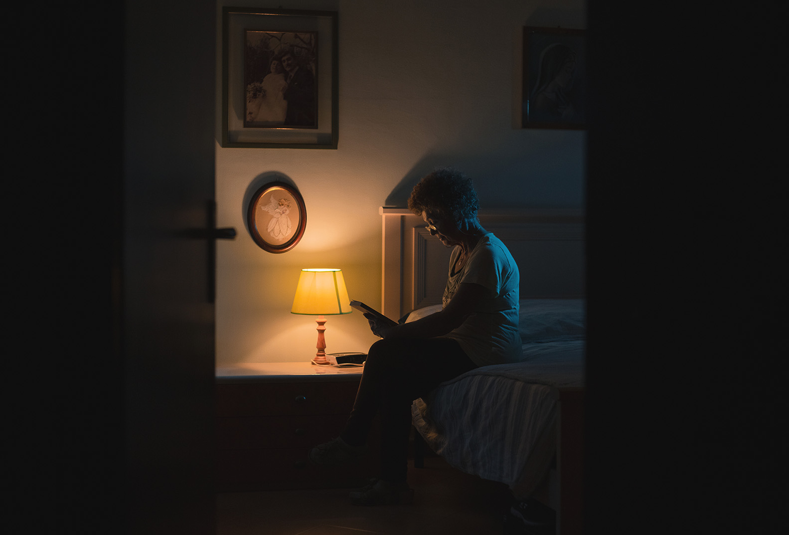 Un gran bel ritratto, intimo ed affettuoso, con una luce calda e dosata alla perfezione che accresce l'atmosfera. La quinta data da parete e porta è forse, a mio avviso , un po' troppo ampia, lo scatto funzionerebbe benissimo anche senza, ma capisco la tua volontà di creare una cornice.