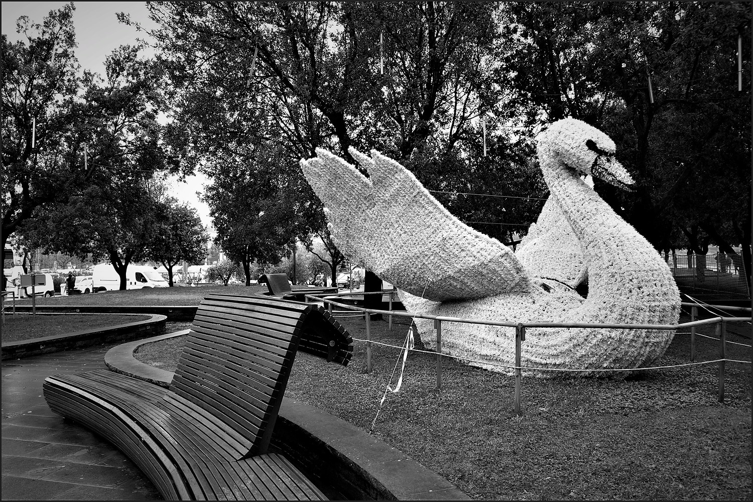 Un buon BN ed una bella la composizione, tutto quell'aspetto sinuoso.. della panchina e dei vialetti..si abbinano bene ha questo bel cigno.. Una buona proposta per me.