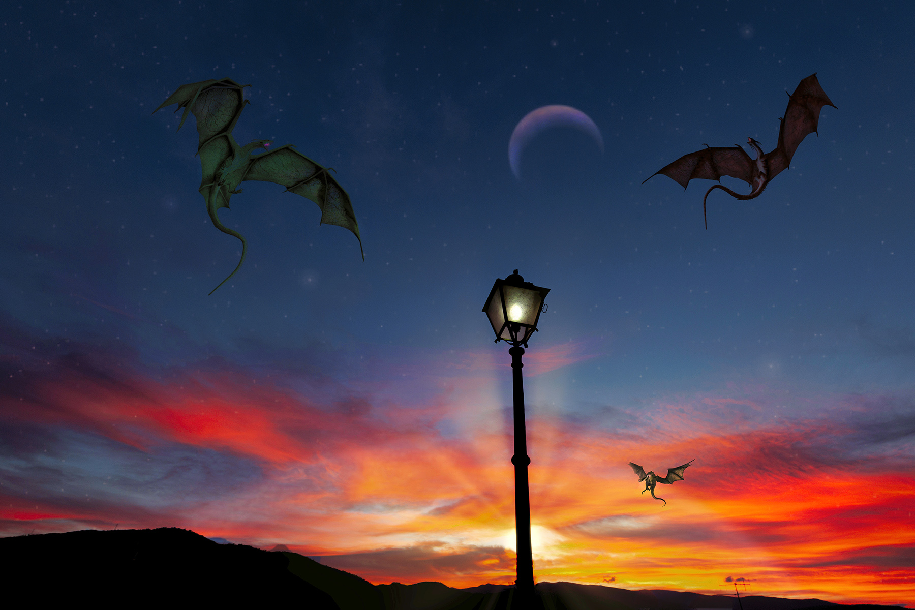 I draghi son la fantasia, il sogno; il lampionaccio (e l'antenna che si scorge più sotto) sono la modernità, il razionalismo, la tecnologia.