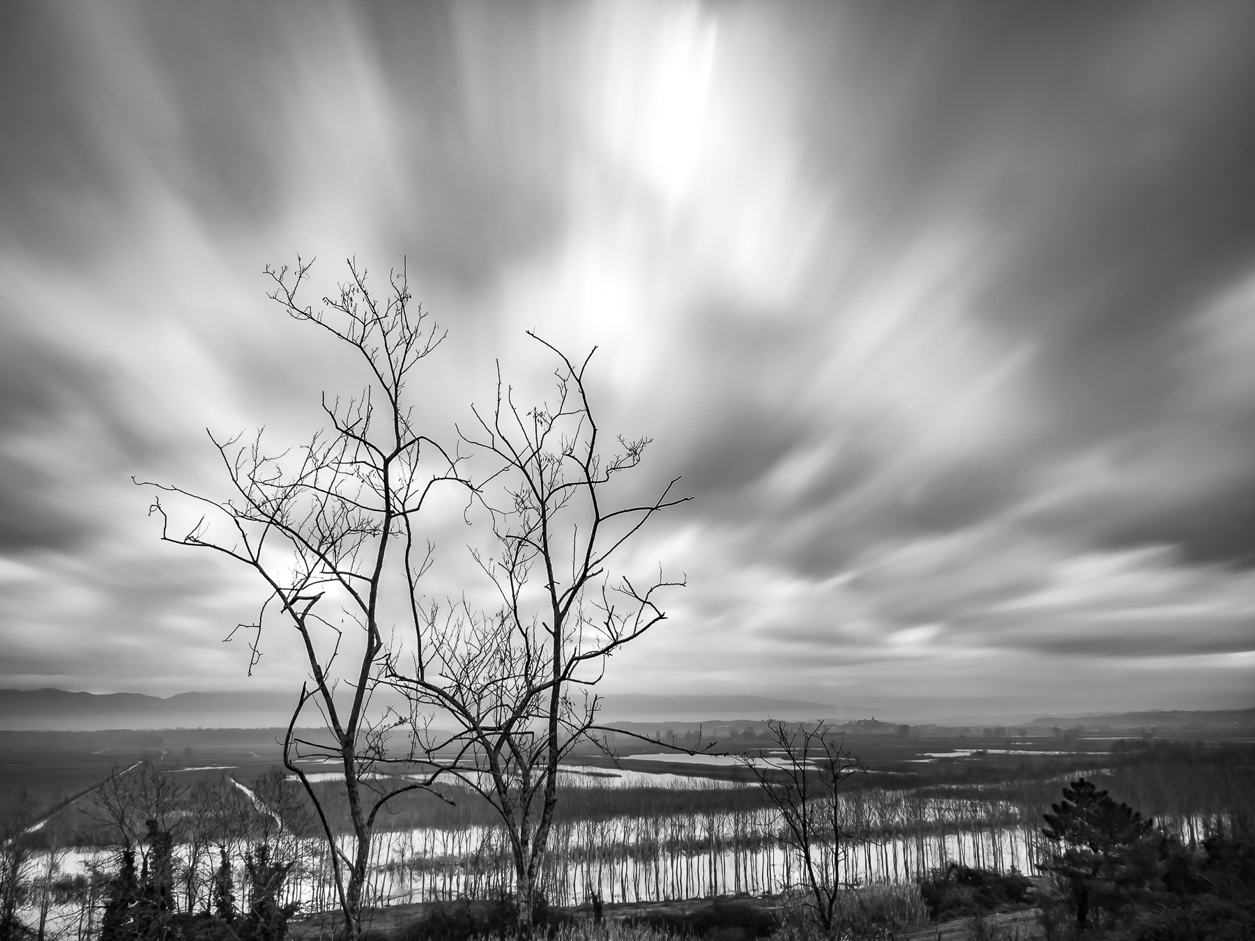 mi piace il contrasto fra la staticità delle ramificazioni in PP e il mosso delle nuvole. Bello anche il gioco di luce dato dalle pozze e corsi d'acqua che animano la vallata. Il BN è ben dosato. A gusto personale avrei fatto un paio di passi indietro per includere la base dei due alberelli protagonisti.