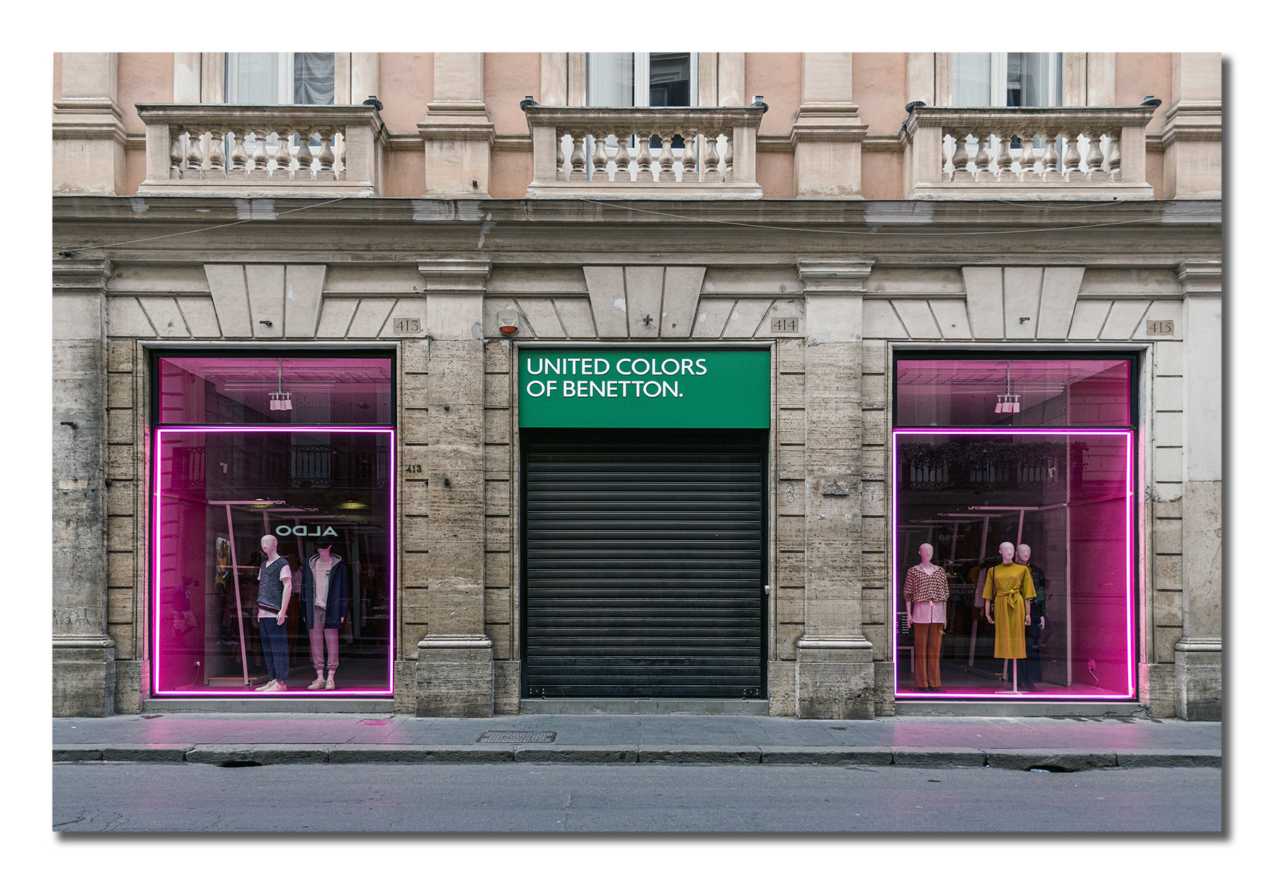 Certamente l'elemento che spicca guardando l'immagine è il colore delle vetrine e dell'insegna che contrastano con la struttura quasi monocromatica dell'edificio.