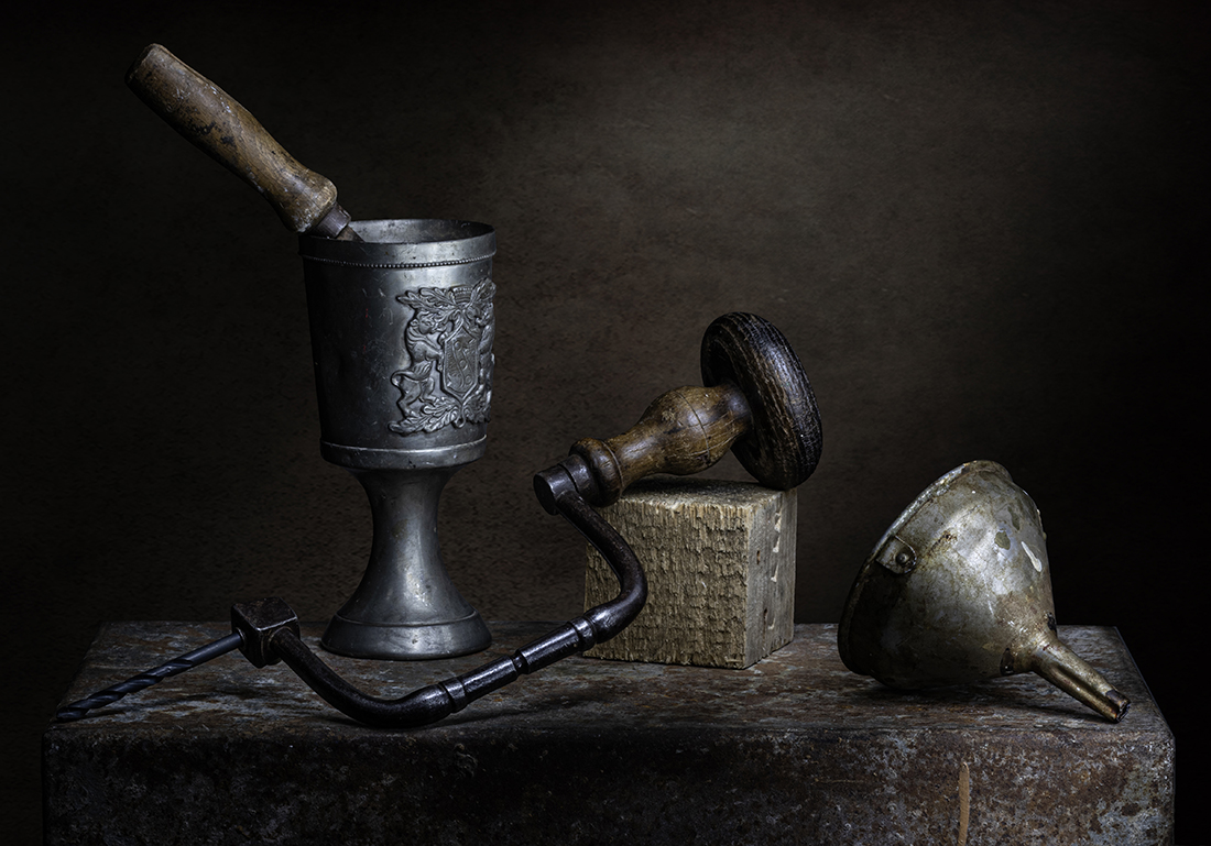 Queste nature morte dai toni scuri illuminati da bagliori metallici sono composte con gran buon gusto. Non semplice e affatto scontato. L'imbuto lo trovo adorabile . Bravo. Ciao  |
