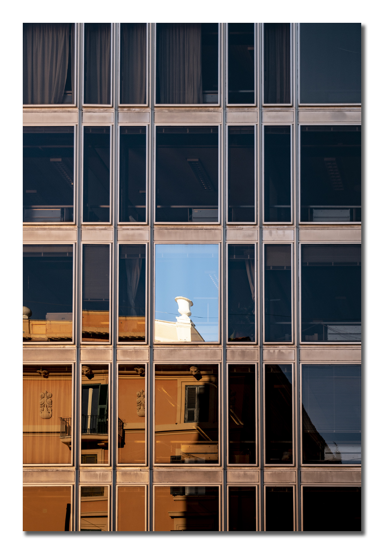 Un ottimo scatto presentato in una veste elegante. Dalle ottime geometrie dei rettangoli in cui si specchiano parti del mondo circostante, al centro dell'immagine dove lo sguardo viene particolarmente indirizzato, e non solo per la maggiore luminosità ma per la sua diversità, è tutto un susseguirsi di un bel colpo d'occhio.