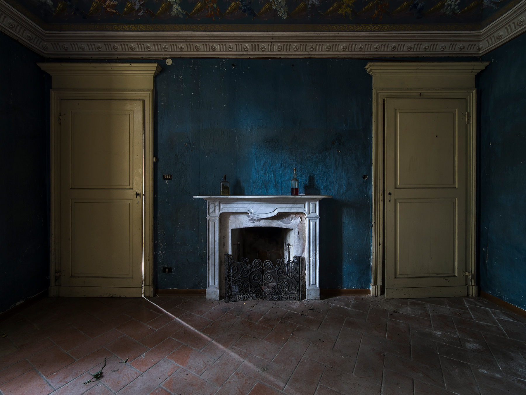 Una composizione rigorosa per questo interno, in cui il ciano ancora piuttosto acceso delle pareti fa a pugni con la decadenza dell'ambiente.