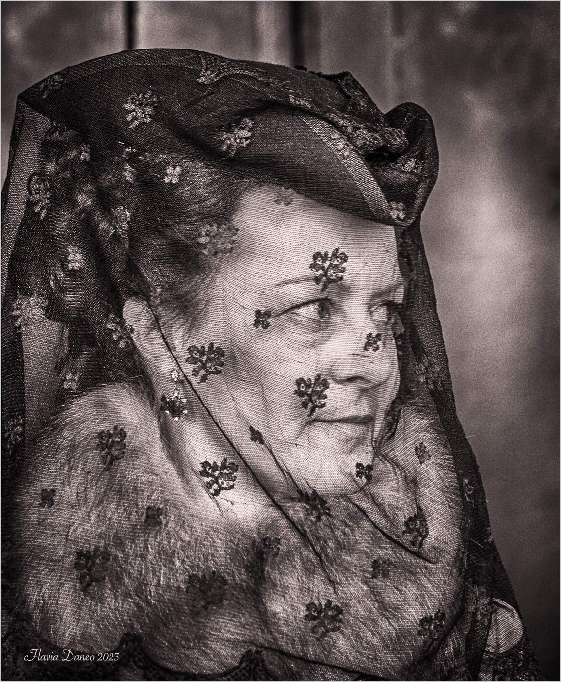 un ottimo ritratto, dietro la veletta si intravede l'espressione attenta e furbetta della signora. Mi piace molto e trovo adatto il viraggio seppia