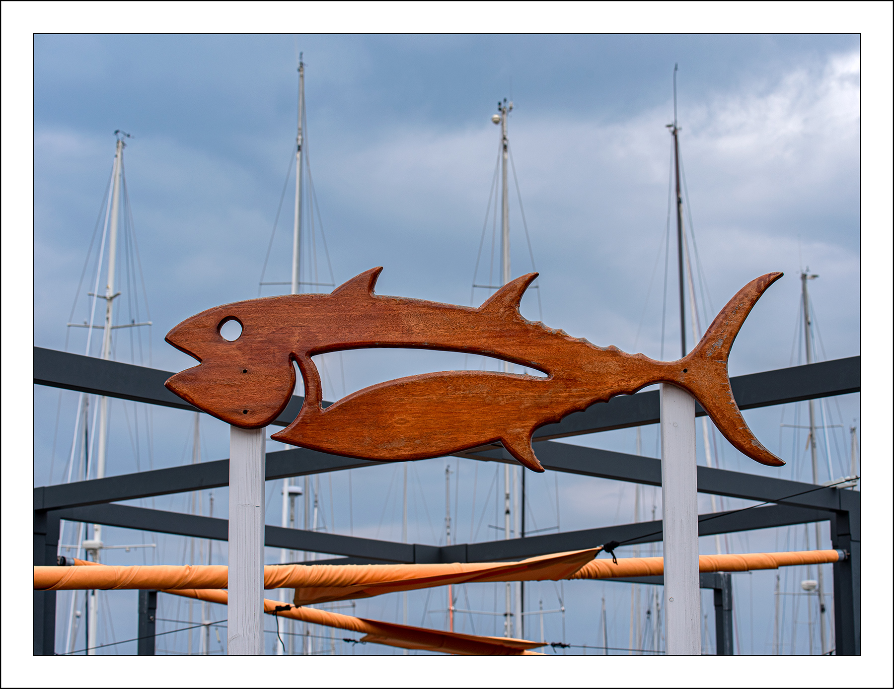 Pesce pazzo e parrebbe un tonno ( ma io preferisco le sardine come le fate lì ) che guizza tra gli alberi così come capita in alto mare ,ancora un bello sguardo d’acqua dove …acqua non si vede