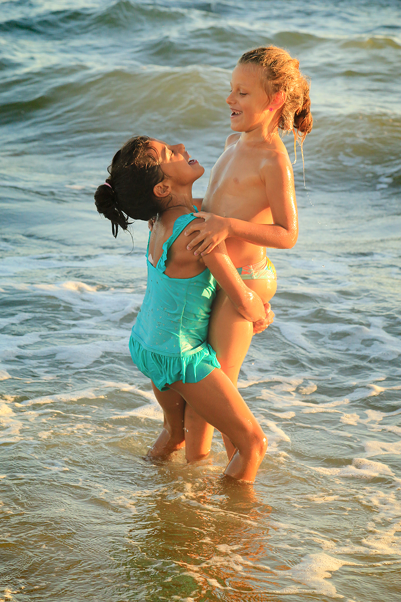 Il gioco gioioso delle bambine sotto la luce dorata del sole si accorda con le onde mosse dello sfondo.