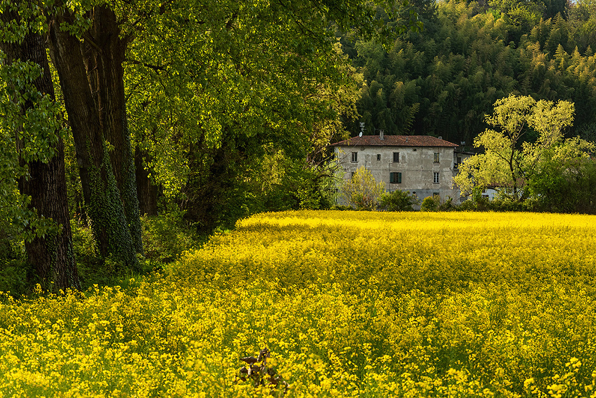 Giallo il colore della primavera, un bel campo di colza fiorito ed il casolare lontano fra un bel gioco di luce/ombra.