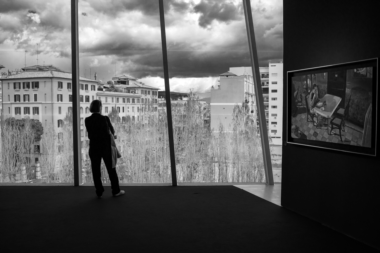 Apparentemente non c'è relazione fra la staticità del dipinto stile anni '50 e la scena che si vive nel resto dello spazio museale con la figura assorta a contemplare il panorama visto dalla grande vetrata.