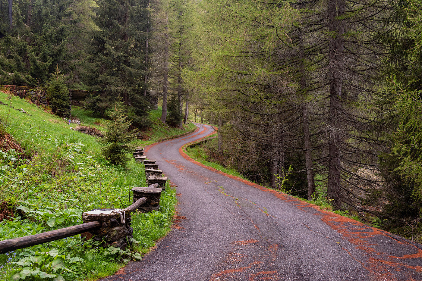 Bellissimo questo scorcio con il serpeggiare della strada nel bosco.