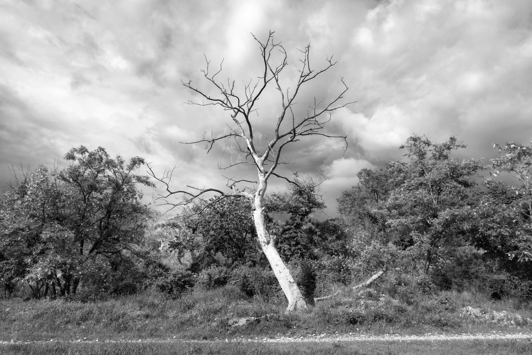L'albero scheletrico si erge al centro protraendosi verso un cielo interessante e dalla forte nuvolosità;