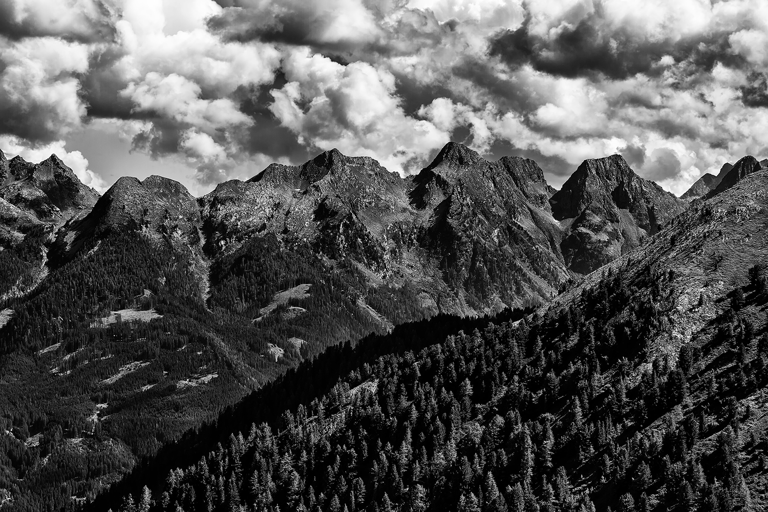 Un cielo potente domina l'essenza dei Lagorai: nude rocce di origine vulcanica che affiorano da infiniti boschi di conifere. È un paesaggio che può emulare quelli famosi del nord America, mai affollato e dai grandi orizzonti. Il bianco e nero è cupo, ricco di dettaglio e di drammaticità e rende onore alla maestosità dei luoghi. Ciao, Francesco _________________ Fotocamere Olympus OMD e PEN, Panasonic G3. Software GIMP