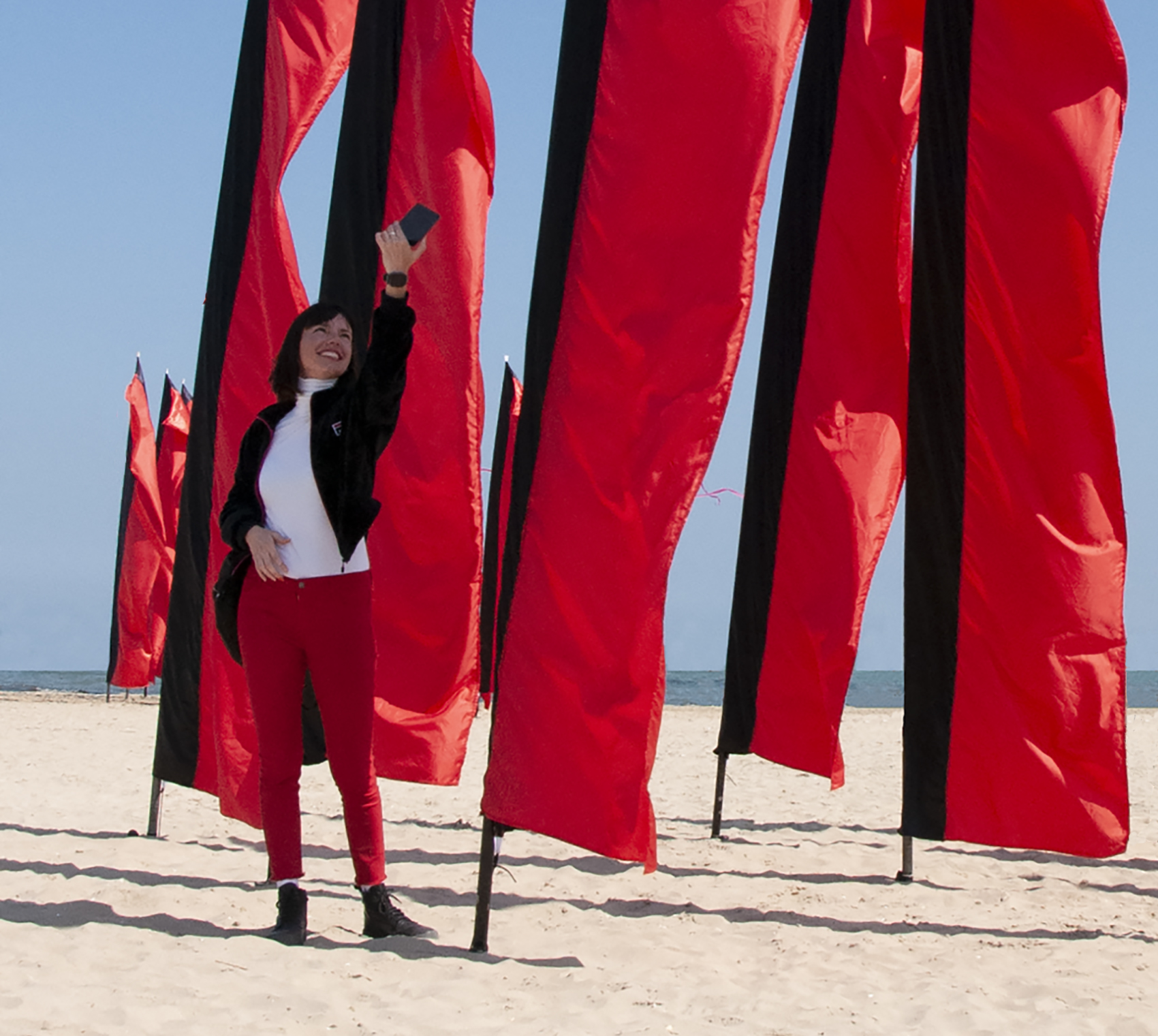 Selfie-mimetismo, la donna in rosso nero in tinta con le bandiere svolazzanti.