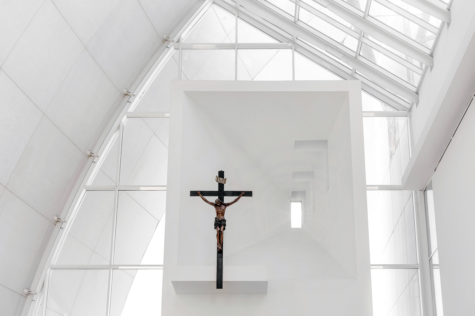L'architettura è molto interessante, ci sono degli intriganti giochi di linee, forme e volumi ed il crocefisso è ben inserito nel contesto.