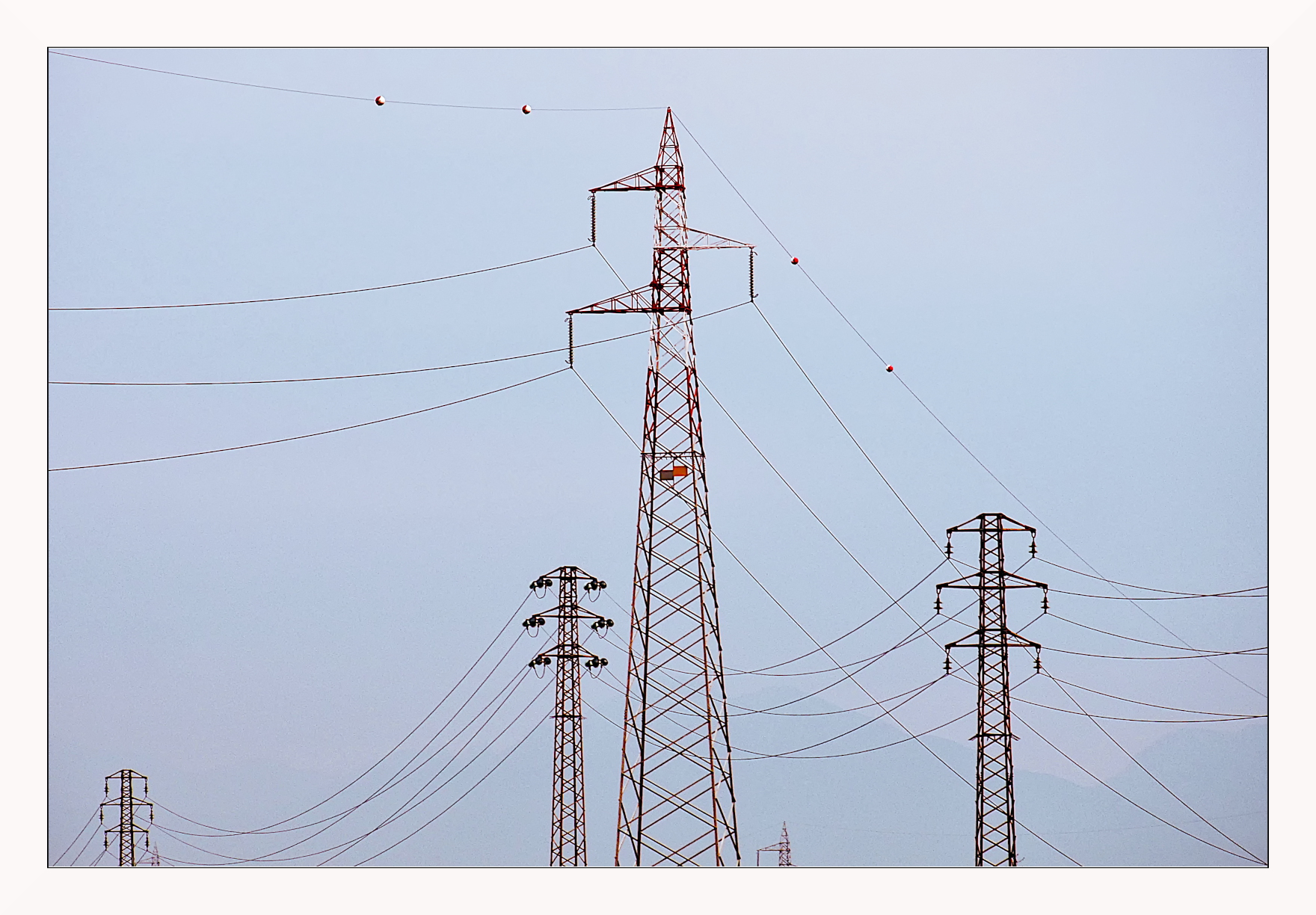 La tua proposta mi ha fatto pensare ad una famiglia... dove tralicci sono le individualità ed i cavi i legami affettivi, sociali, economici che li legano. Forse il caldo inizia a farmi male...!