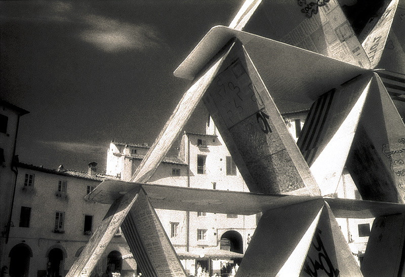 La struttura in primo piano sembra una installazione che forma una casa fatta con mega carte da gioco. E' un taglio un po' strano e sbilanciato con chiusure ai bordi non troppo ideali e pulite. Il bianco e nero non è male e sembra come da una stampa in bianco e nero a pellicola a alta sensibilità per via della grana di fondo.