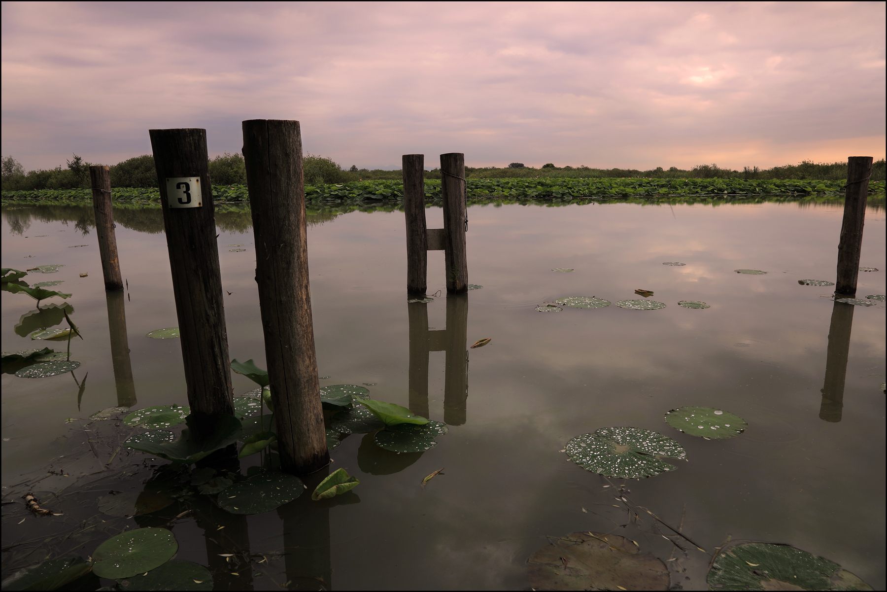 La location è uno dei laghi di Mantova in fondo i fior di loto formano un largo semicerchio ed i pali in acqua sono storti di suo. Probabilmente la sensazione di pendenza si ha perchè non vi è una linea dritta a cui far riferimento ma a dire il vero non saprei.