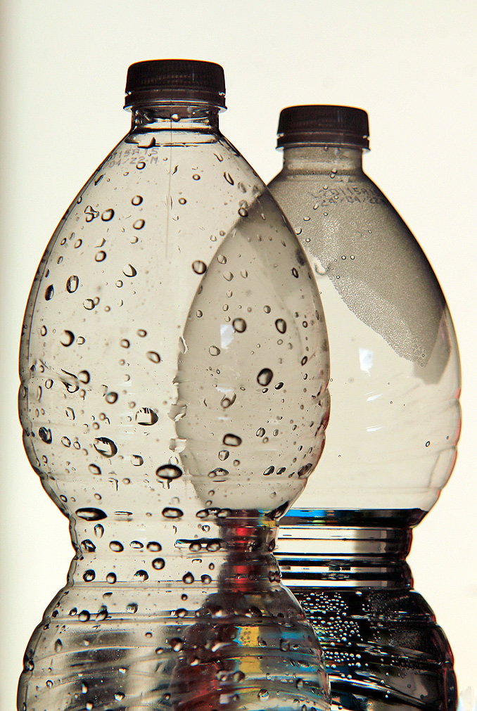 Mi piacciono molto le gocce della prima bottiglia, grandi, nitide e ben separate tra di loro, come mi piacciono i colori, assortiti e saturi, della zona di intersezione.