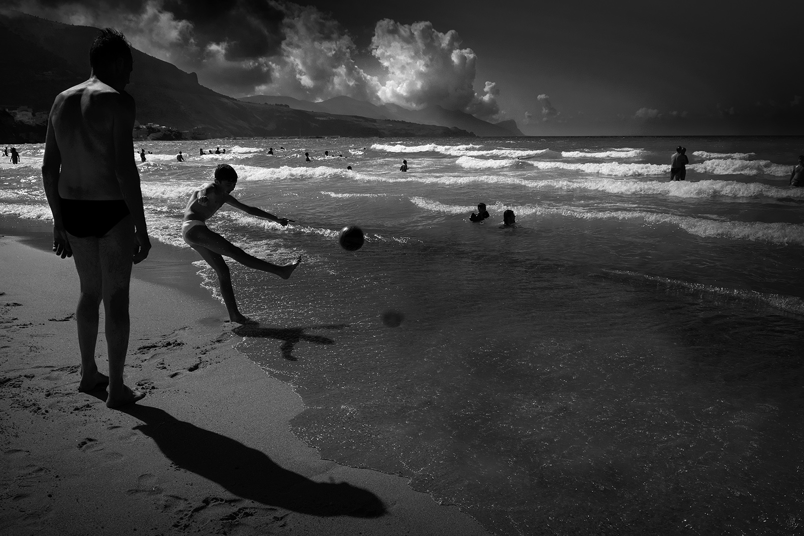 Mi piacciono molto la conversione alquanto decisa e la sottoesposizione, il ragazzo che calcia la palla e le bianche increspature del mare riprese dalle nuvole sullo sfondo.