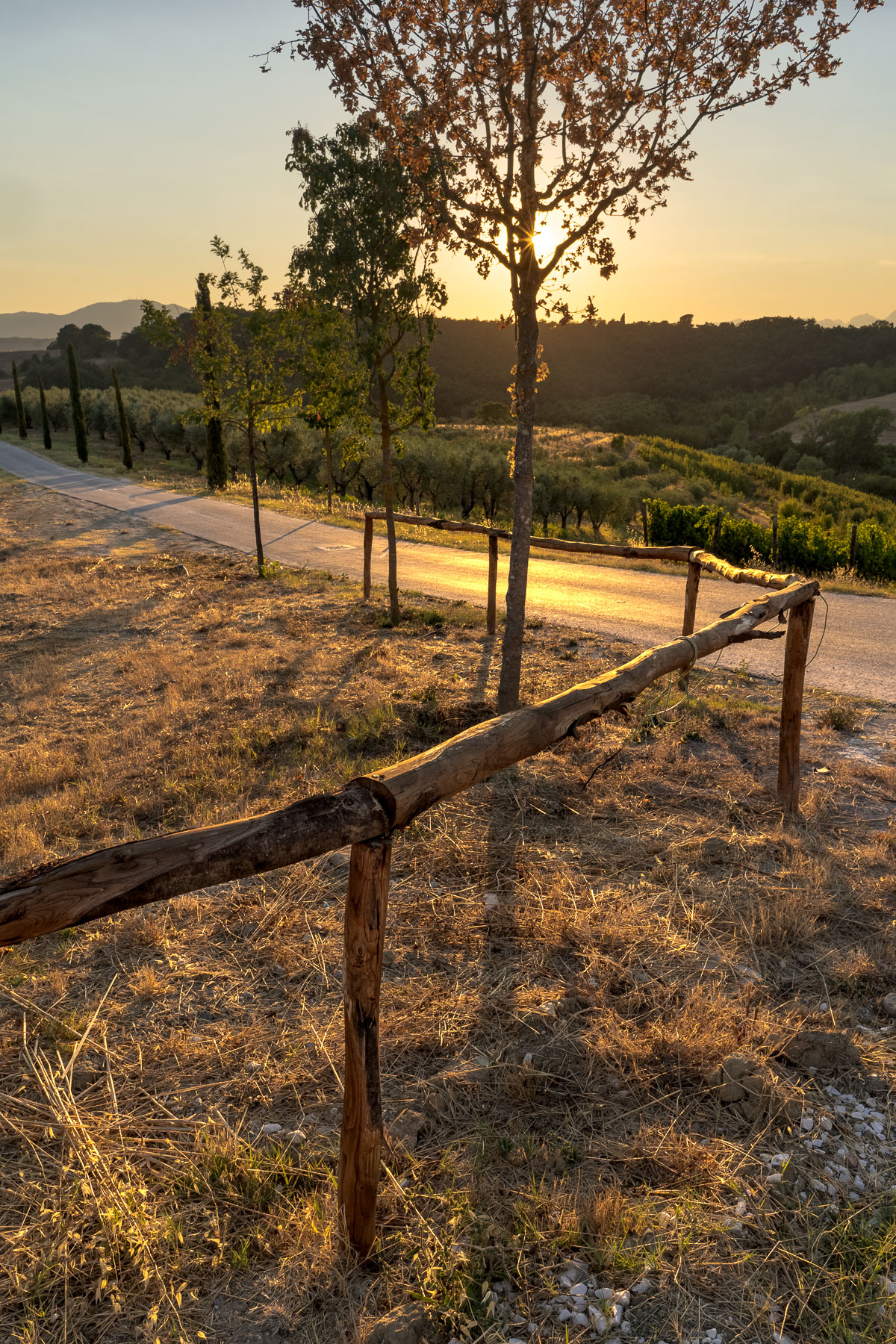 Hai ben gestito la luce schermando il disco solare con il fusto dell'alberello. La palizzata accompagna si raccorda piacevolmente verso la stradina donando profondità e una via di fuga.