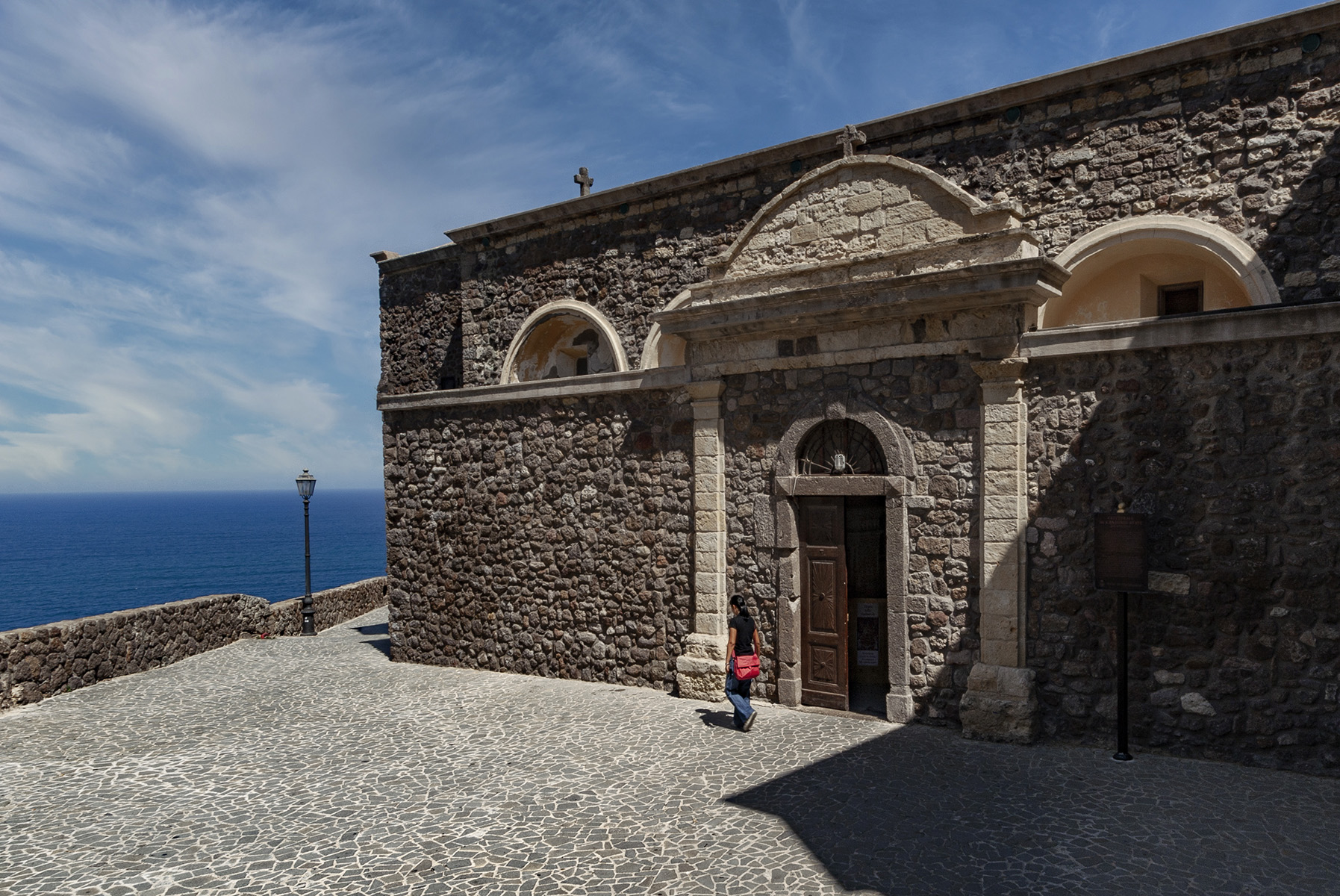 La chiesetta con sfondo misto mare/cielo è un veduta che gratifica lo sguardo, la composizione sulla diagonale è corretta così come l'inserimento della passante con il suo vivace tocco di rosso.