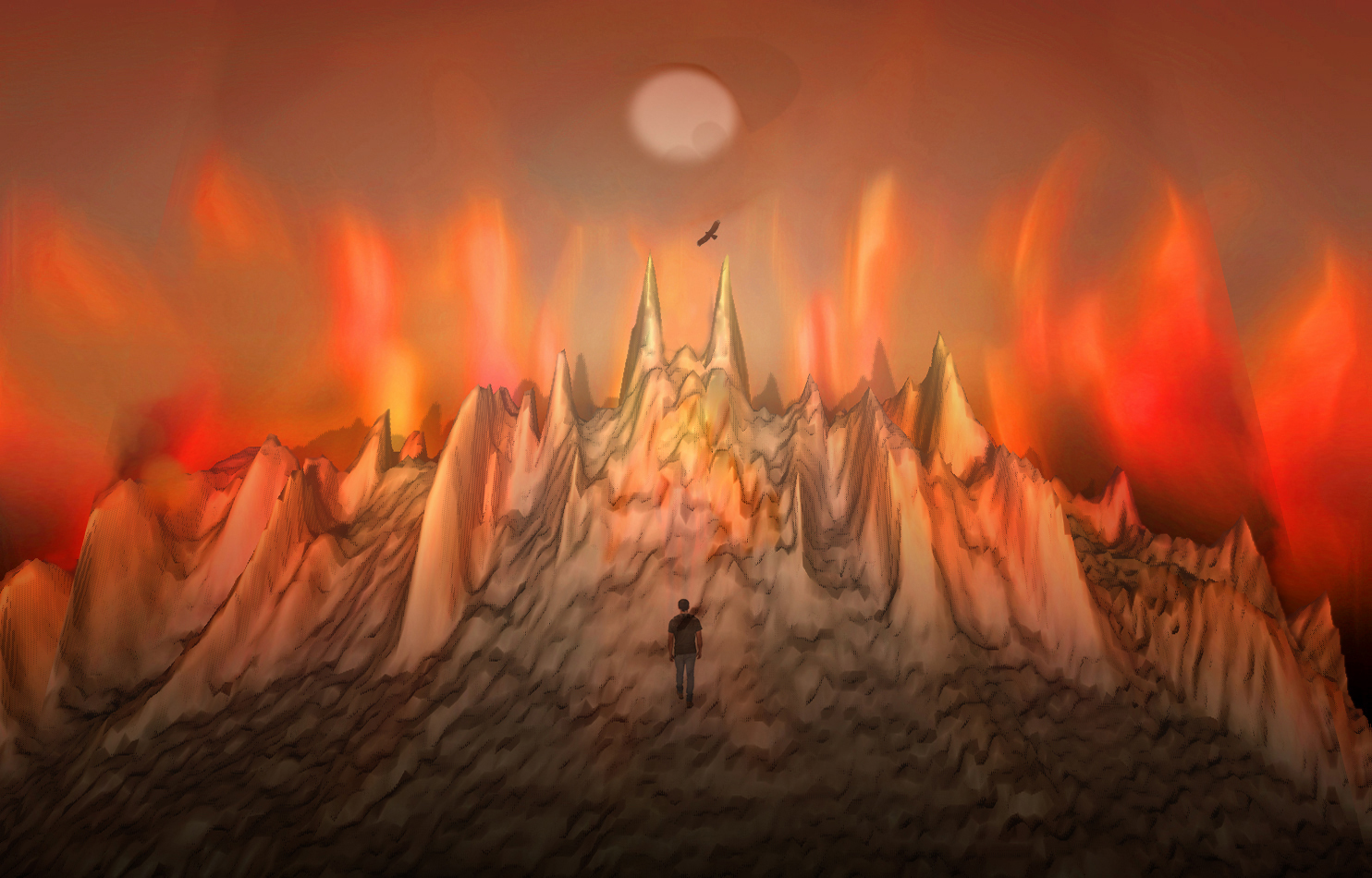 Un tramonto dai toni infuocati, cime aguzze che diventano fiamme, un volo solitario e l'uomo che si avventura in questo misterioso mondo di fantasia
