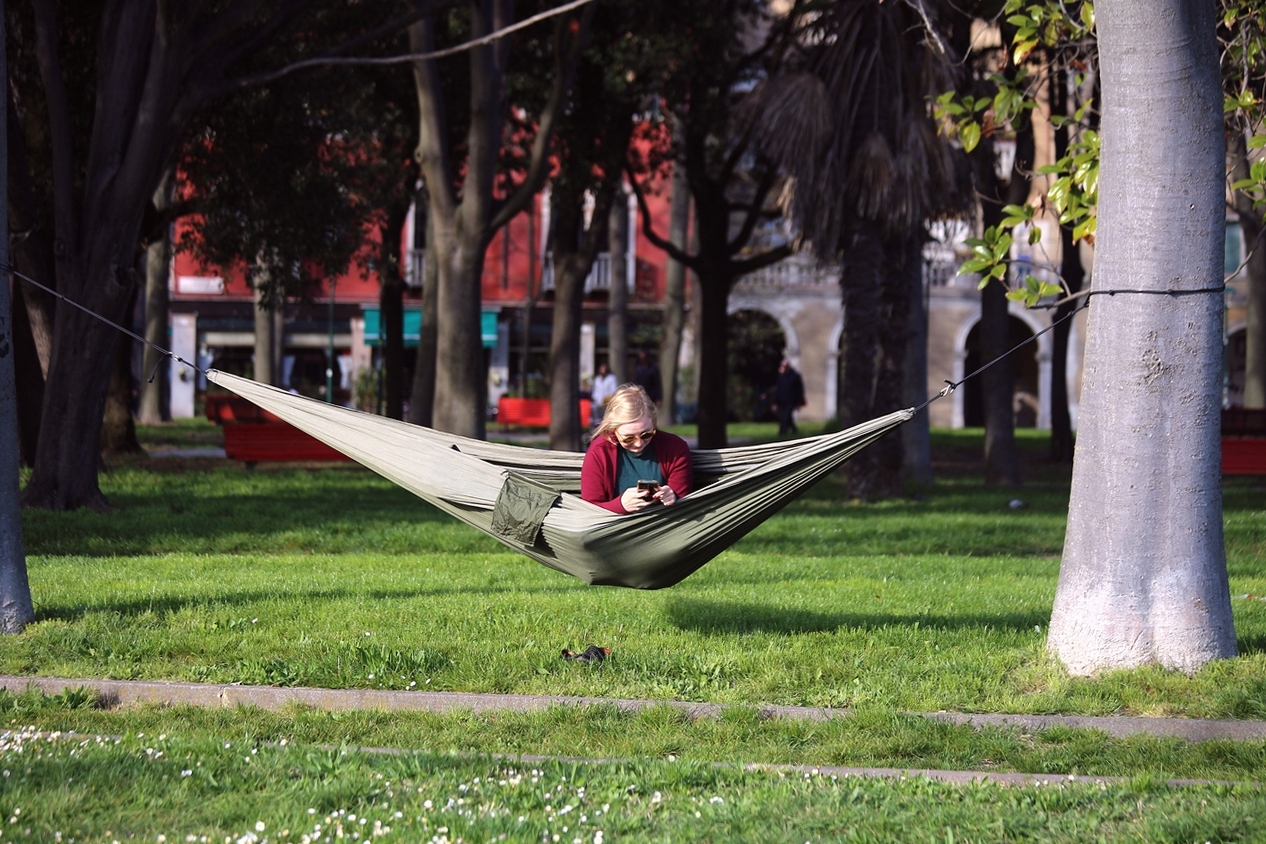 Mi piace l'installazione che la signora ha messo in atto per rilassarsi.