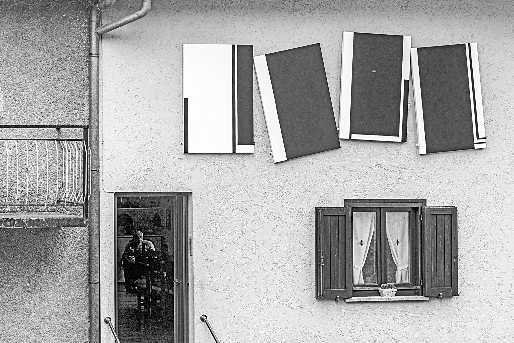 | In mezzo a vari rettangoli si inserisce quel rettangolo di vita intravista dalla fessura della porta. Giusta la scelta del bianco e nero a mio avviso che definisce un impronta anche più grafica per l'immagine di come poteva essere a colori. Mi piace. Brava. Ciao, Tiziano