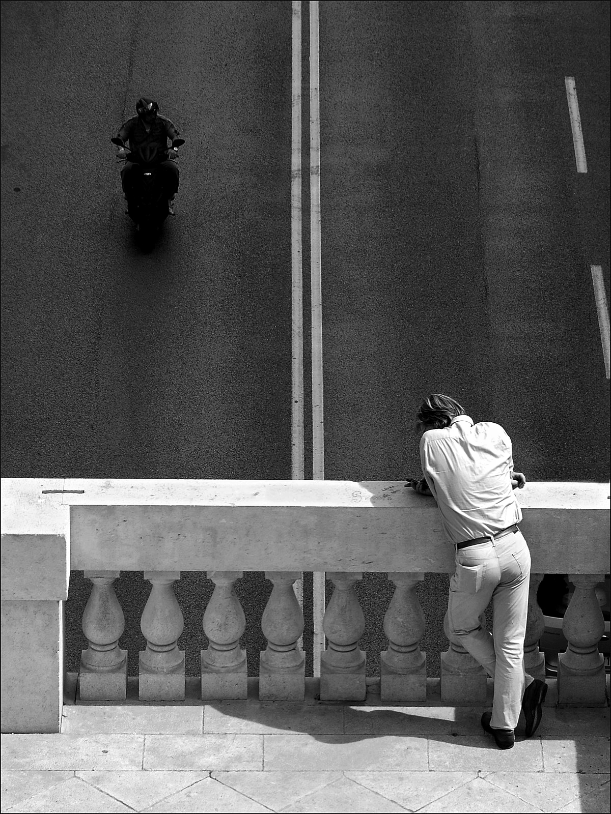 Mi piace molto il punto di ripresa, al primo sguardo la posa dell'uomo dà l'impressione che sia ripreso dalla stessa altezza, e non dall'alto, ma poi si nota la strada vista dall'alto e l'insieme appare incongruo, pare quasi un fotomontaggio. Per questo il fatto di mantenere un forte contrasto tra l'uomo e la balaustra, molto illuminati, e la strada con il motociclista in ombra funziona perché sottolinea questo apparente contrasto tra le due prospettive.
