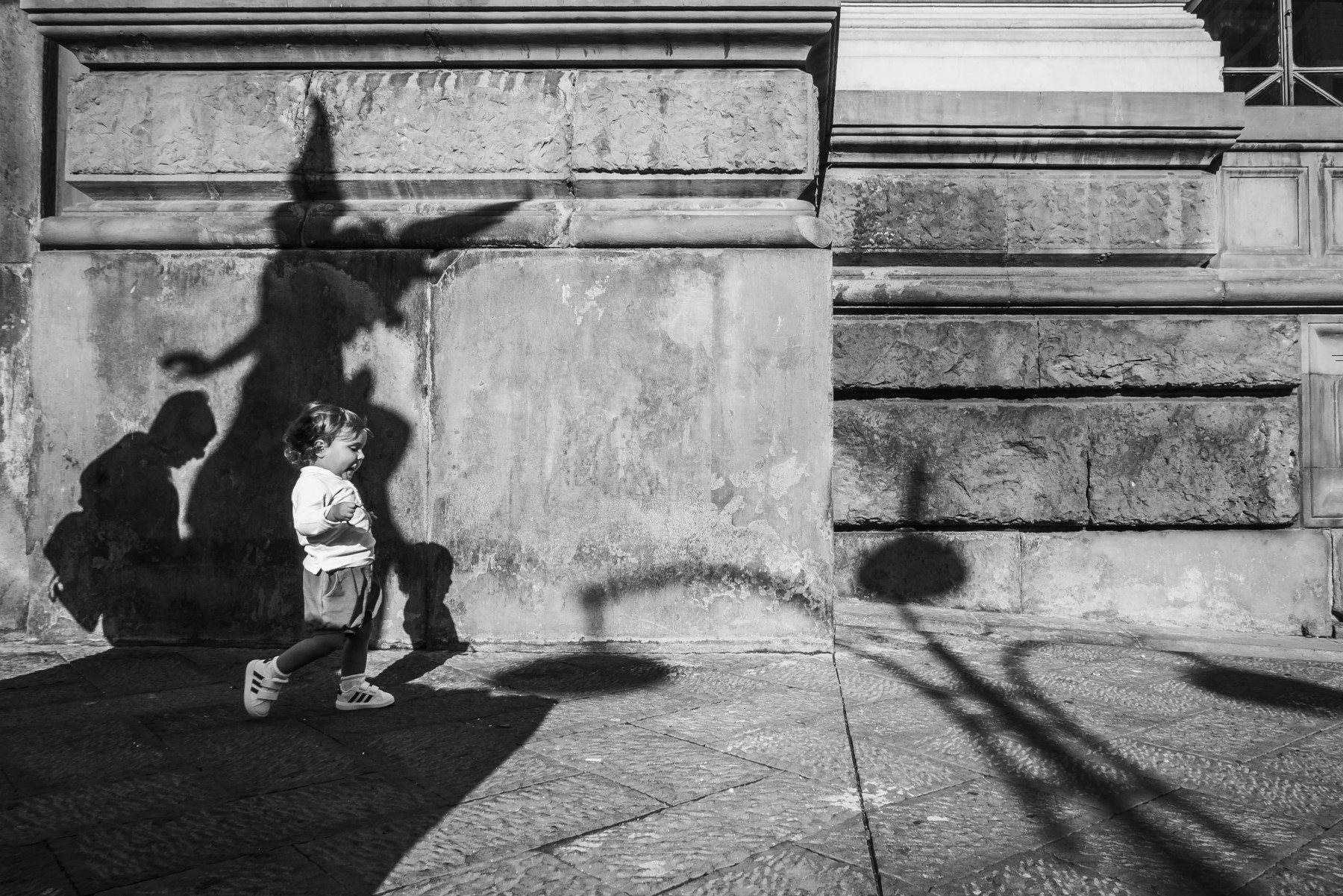 Figura minacciosa o angelo protettore, la foto ha un suo sapore street proprio nella possibilità di leggervi significati oltre ciò che è strettamente visibile. E a vegliare, per maggior sicurezza, appare anche l'ombra di un genitore. Crea equilibrio l'ombra grafica del lampione sul versante soleggiato a destra e il bel bianco e nero fa il resto. Uno scatto riuscito.