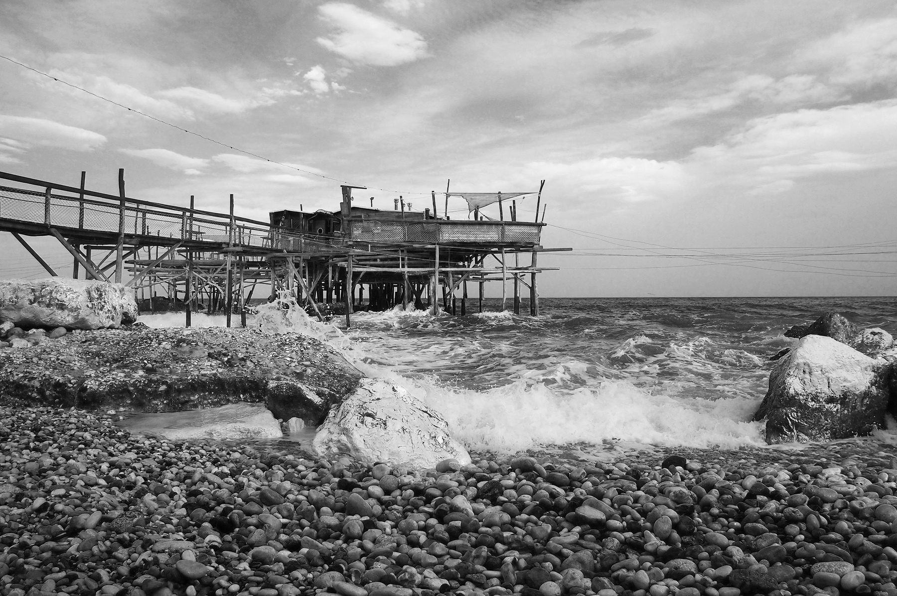 il punto di ripresa basso è indovinato e ti permette di avere un bel primo piano di sassi che introducono al fascino del trabocco. Bene anche il BN lavorato con cura, attenzione all'orizzonte che pende leggermente