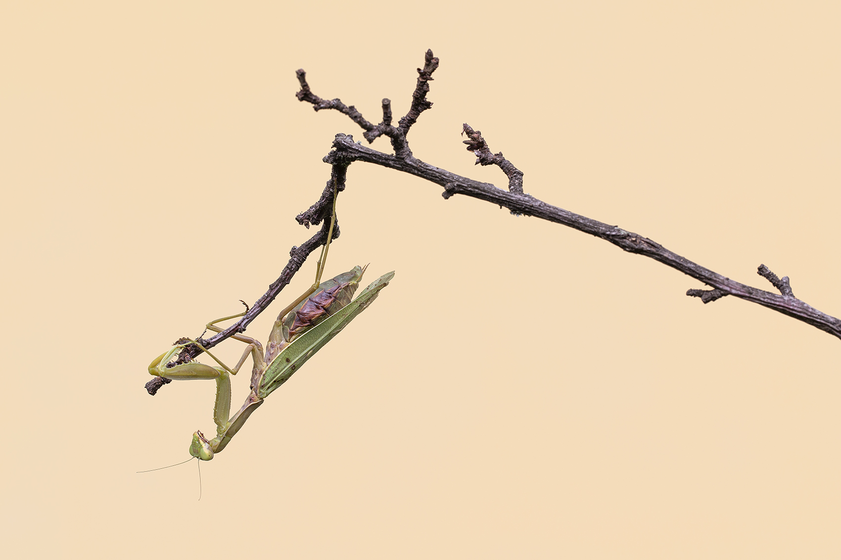 Mantide ripresa nella classica posa con la testa il basso. Il parallelismo mi sembra buono e la maf copre tutto il soggetto e buono anche il dettaglio e lo sfondo omogeneo e di un tono che fa emergere bene il soggetto.