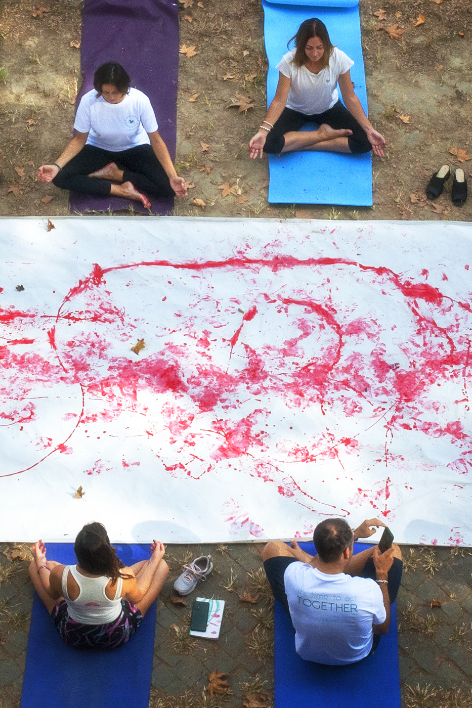 Per terin: non ero interessato a documentare fotograficamente quanto si stava svolgendo, ma ha richiamato la mia attenzione il paradosso di una persona "in meditazione" insieme a svariate altre, distolta dall'imprescindibile smartphone. Il resto non aveva per me particolare importanza: in una foto si mostra qualcosa mentre qualcos'altro rimane celato. In un'inquadratura più larga quello che per me era essenziale si sarebbe disperso.