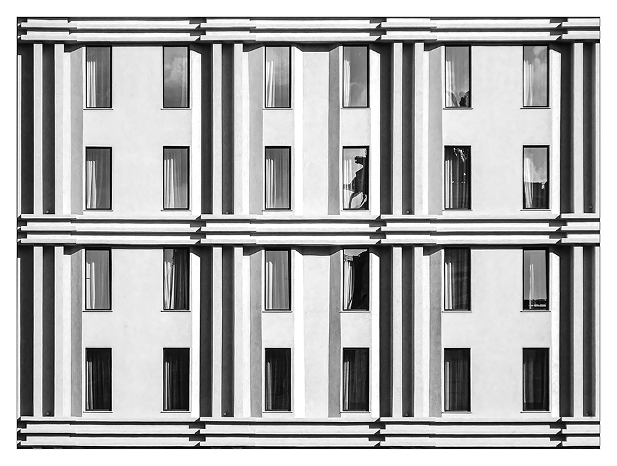 Bella precisa la ricerca geometrica dell'edificio perfettamente espressa con un idineo bianco e nero che apprezzo molto. Si intravede nel riflesso centrale la sagoma di un cavallo, almeno così mi pare. Bella. Ciao, Tiziano  |