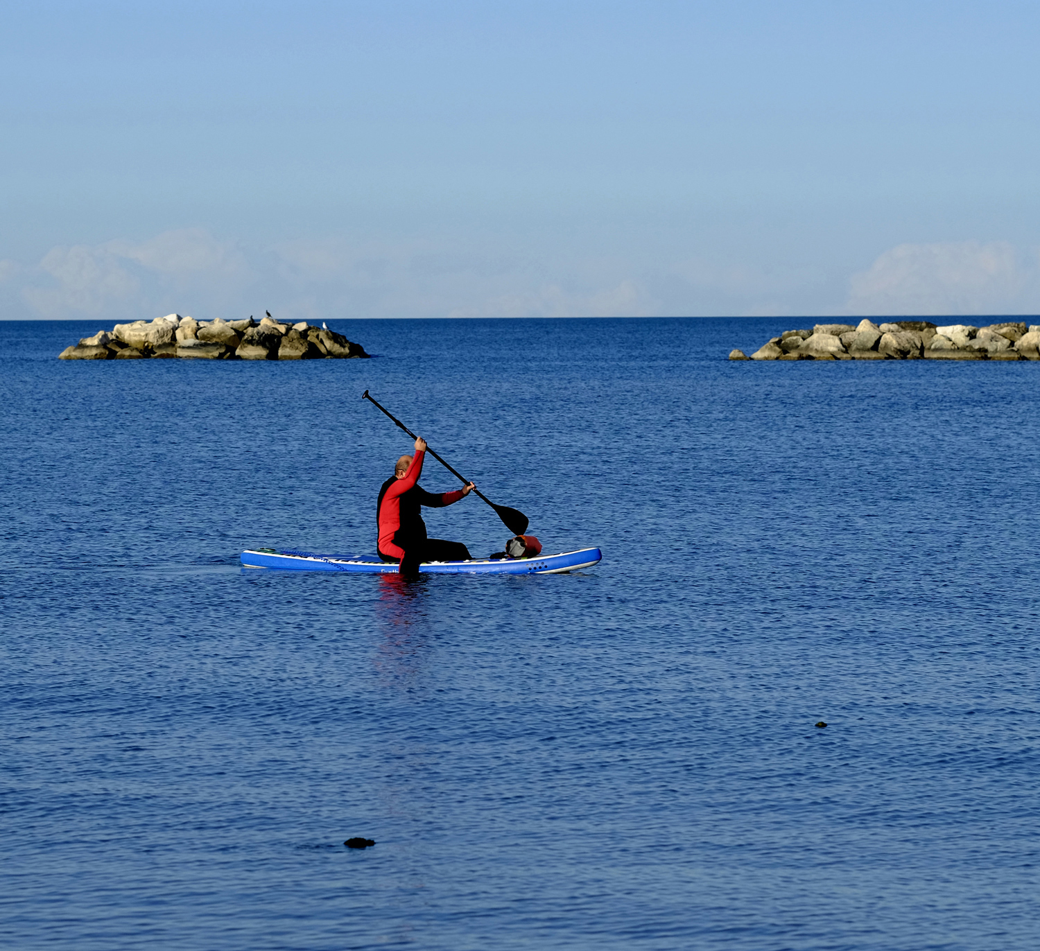 Peccato che tu abbia fissato la pagaiata proprio nel momento in cui il viso è nascosto. Per il resto, a mio gusto taglierei un po' di mare di base posizionando l'orizzonte praticamente a metà fotogramma.