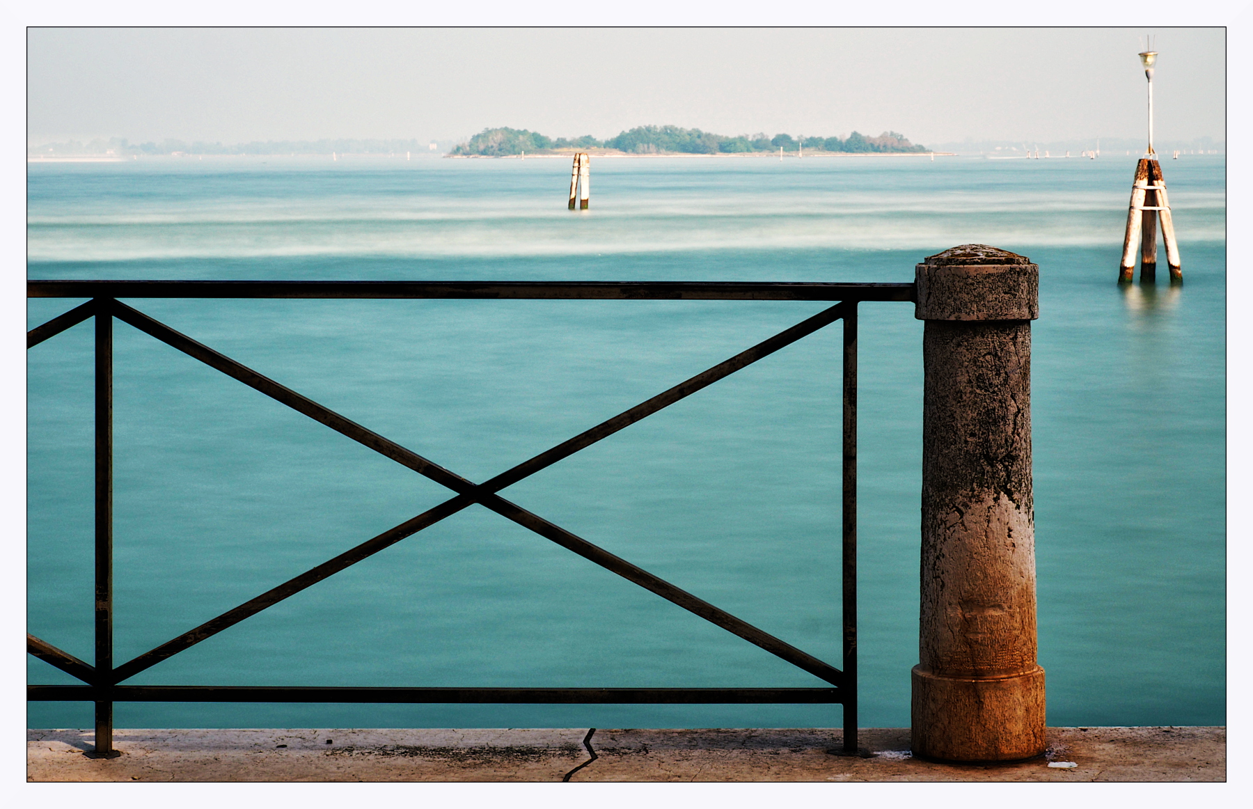 Ottimamente composta, con una ragionata distribuzione dei pesi. Perfette le due strisce bianche lasciate da qualche motoscafo che movimentano, anche cromaticamente, la placidità delle acque lagunari. Bruciate parzialmente, purtroppo, le bricole. Ciao 🤗